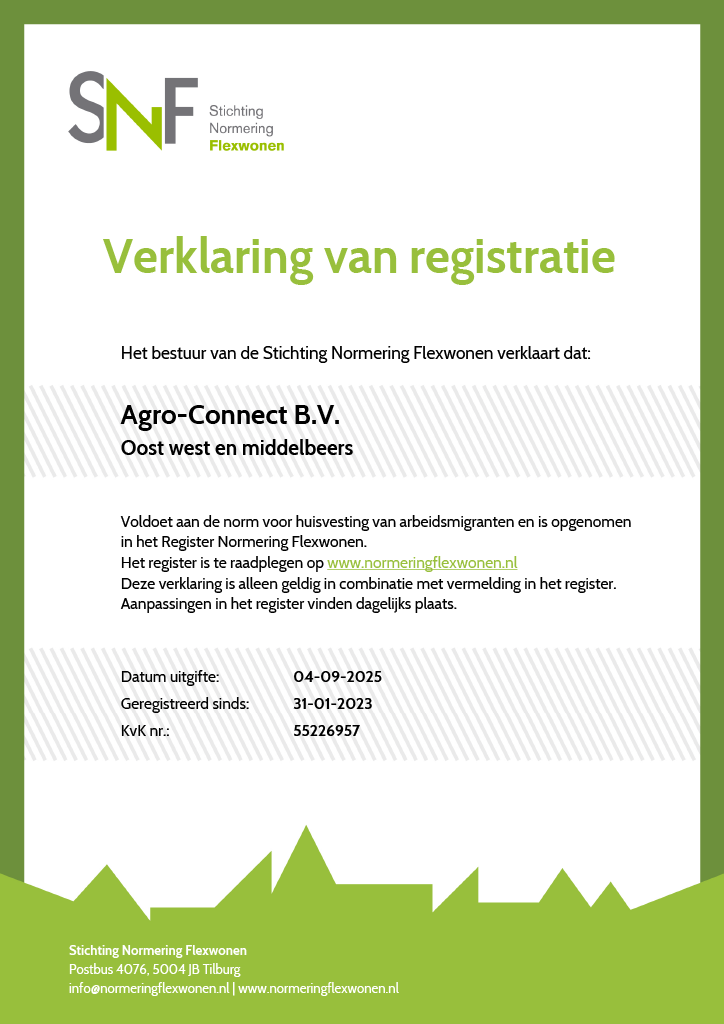 Stichting Normering Flexwonen beheert het register van ondernemingen die aan de norm voor huisvesting van arbeidsmigranten voldoen en onderhoudt deze norm.